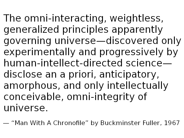 [T]he omni-interacting, weightless, generalized principles apparently governing universe—discovered only experimentally and progressively by human-intellect-directed science—disclose an a priori, anticipatory, amorphous, and only intellectually conceivable, omni-integrity of universe.